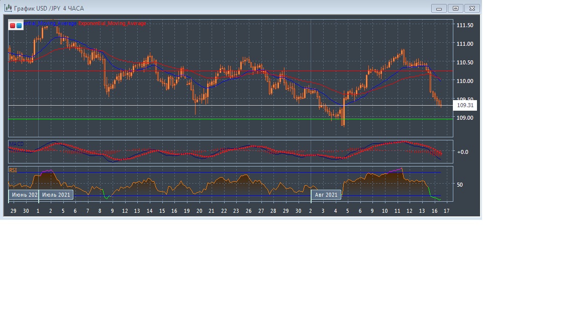 Скользящие средние с периодом 21 и 55 дней развернулись вниз, ускорились, свели расхождение до ноля и сформировали сигнал на продажу, когда EMA21 пересекла EMA55 сверху вниз, что позволяет ожидать продолжение нисходящей тенденции на этом рынке в краткосрочной перспективе. Четырёхчасовой график остаётся ниже экспоненциальных скользящих средних, что так же говорит нам о нисходящем потенциале этого рынка сегодня.