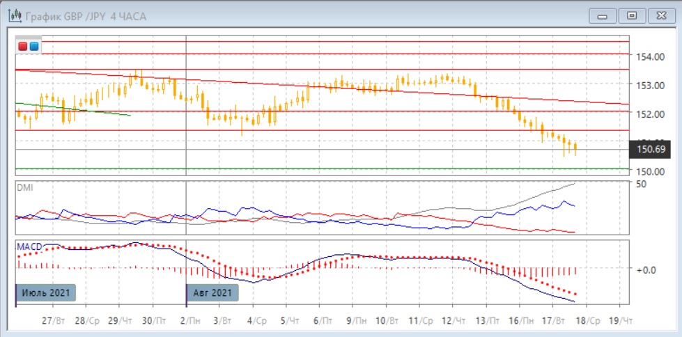 На четырёхчасовом графике снижение продолжилось после образования двух близких к "молоту" свечей. Это является медвежьим сигналом, так как бычий даже после значительной волны снижения без отскоков не сработал. Более вероятным является продолжение снижения с целью на 150,00, (ближайшая поддержка). По индикаторам направленного движения тенденция снижения усилилась: превышение DM- над DM+ увеличилось, уровень ADX вырос, гистограмма MACD находится в отрицательной зоне, линия MACD имеет отрицательный наклон.