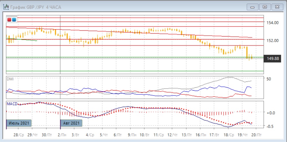 На четырёхчасовом графике резкое снижение от уровня сопротивления 151,35 предполагает, что в ближайшей перспективе снижение может продолжиться - сильный импульс обычно какое-то время сохраняется. При этом пара может закрепиться ниже уровня 150,00, что облегчило бы дальнейшее снижение в краткосрочной перспективе. По ADX тенденция снижения сильная: превышение DM- над DM+ большое, ADX на высоком уровне. Образовалось бычье расхождение минимумов пары и гистограммы MACD, что увеличивает вероятность отскока, но сигнал не получил фактического подтверждения (им могло бы быть восстановление выше уровня 150,00)
