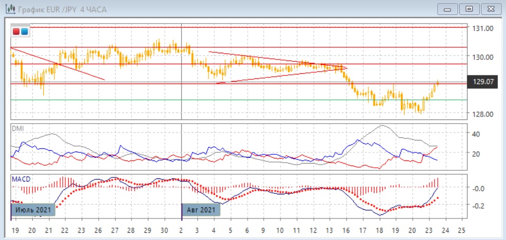 На четырёхчасовом графике пара достигла сопротивления на 129,00, от преодоления которого, вероятно, будет зависеть дальнейшее движение в краткосрочной перспективе. Уровень 129,00 был поддержкой в конце июля и нижней границей треугольника в начале августа. Если пара останется ниже этого уровня, может образоваться третий с 17 августа относительный максимум около 129,00, что укрепило бы сопротивление и увеличило вероятность снижения. Если рассматривать диапазон 128-129, в случае если пара вернётся ниже 129,00, но тогда целью движения в диапазоне была бы нижнее граница. Но если пара преодолеет уровень 129,00, то это отрыло бы дорогу к продолжению роста со следующей целью на 129,70.