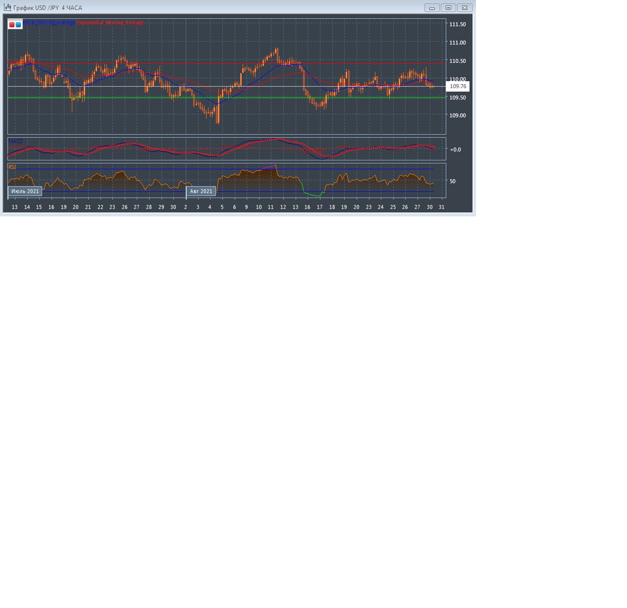 Скользящие средние с периодом 21 и 55 дней разворачиваются вниз и похоже формируют сигнал на продажу, сокращая расхождение, что позволяет ожидать формирование нисходящей тенденции на этом рынке в краткосрочной перспективе. Четырёхчасовой график вышел в область ниже экспоненциальных скользящих средних, что подтверждает формирование нисходящего тренда на этом рынке в краткосрочной перспективе.