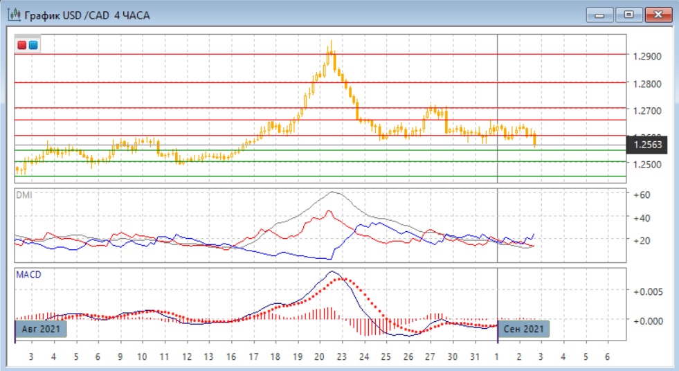 На четырёхчасовом графике происходит преодоление уровня поддержки 1,2600. Так как ранее относительно долго задержалась в узком диапазоне 1,2600-1,2655, при выходе из диапазона вниз снижение может ускориться. По индикаторам направленного движения тенденцией становится снижение: DM- теперь выше DM+, что отливает ситуацию от флэта в конце августа.