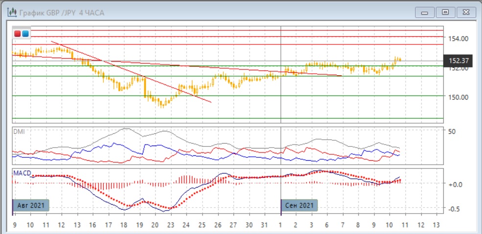 На четырёхчасовом графике также виден выход пары из диапазона 151,30-152,00 вверх. Так как ранее пара относительно долго находилась в узком диапазоне, рост может ускориться, так как пара уже вышла из диапазона При откате поддержки можно ожидать на 152,00. Ближайшее сильное сопротивление на 153,50. По индикаторам направленного движения тенденцией становится рост, хотя сейчас индикаторы не выходят за пределы движения во флэте: DM+ выше DM-, гистограмма MACD растёт в положительной зоне, линия MACD получила положительный наклон.