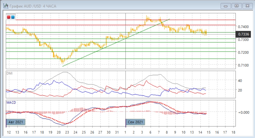 На четырёхчасовом графике пара выходит вниз из диапазона 0,7350-0,7400. Если пара закрепится ниже 0,7300, вероятно снижение продолжится до "круглого" уровня 0,7300 и ниже, сильная поддержка в этом масштабе может быть на 0,7270. Относительные максимумы и минимумы пары с 10 сентября снижаются, это также медвежий сигнал. По ADX тенденцией является снижение: DM- устойчиво выше DM+