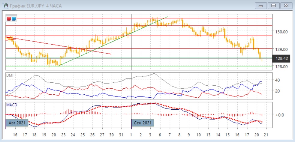 На четырёхчасовом графике после преодоления поддержки на 129,00 пара достигла следующего уровня поддержки на 128,45. Это слабый уровень, и пока не видно предпосылок к развороту. Некоторое замедление снижения видно по образованию бычьего расхождения минимумов пары и гистограммы MACD. С другой стороны, наклон волн снижения увеличился. Снижение происходит быстро, и уровни поддержки легко преодолевались. По ADX тенденция снижения относительно сильная: превышение DM- над DM+ большое, ADX на высоком уровне.