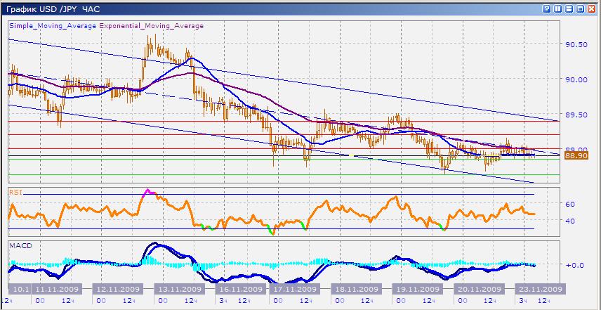 Пара продолжает свое снижение в пределах нисходящего канала. В четверг попытка роста выше 89.40 оказалась неудачной и пара затем начала снижаться. Снижение завершилось на уровне 88.70, где пара получила поддержку от нисходящей линии канала, и после коррекции верх закрылась в пределах 89.00. В пятницу торги шли неактивно, пара по-прежнему встречала сопротивление от средней линии канала. С начала сегодняшних торгов пара торгуется с небольшим понижением. Средние скользящие ЕМА21 и ЕМА55 стабилизировались, индикаторы MACD и RSI находятся ниже своих центральных линий и слабо растут. Цель пары вверх — тестирование уровня 89.00 ( с преодолением сопротивления ЕМА55), далее 89.20 и затем 89.40 (с сопротивлением от верхней границы канала). Движение вниз направится к 89.85 (с поддержкой паре от ЕМА21) и далее к минимуму 19 ноября на уровне 88.63.