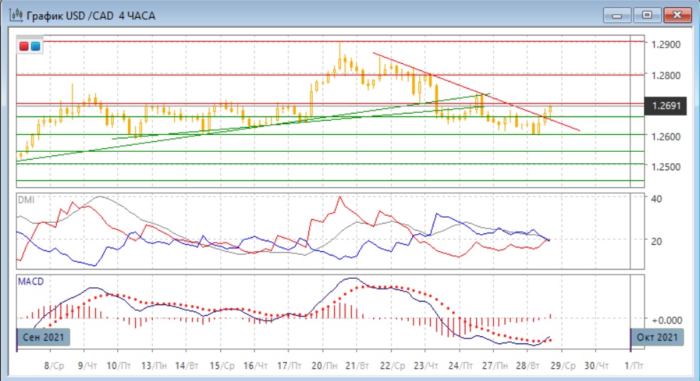 На четырёхчасовом графике пара преодолела нисходящую линию тренда, если строить её с 20 сентября. Кроме этого, была нарушена последовательность снижения относительных максимумов и минимумов пары. Это может говорить от развороте в этом масштабе. Однако сейчас пара находится ниже сильного сопротивления на "круглом" уровне 1,2700, риск отката от которого повышенный. Но при преодолении уровня 1,2700 рост, исходя из текущего диапазона 1,2600-1,2700, может достичь следующего "круглого" уровня 1,2800. По индикаторам направленного движения тенденцией может стать рост: превышения DM- над DM+ сейчас нет, гистограмма MACD перешла в положительную зону после роста, линия MACD разворачивается.