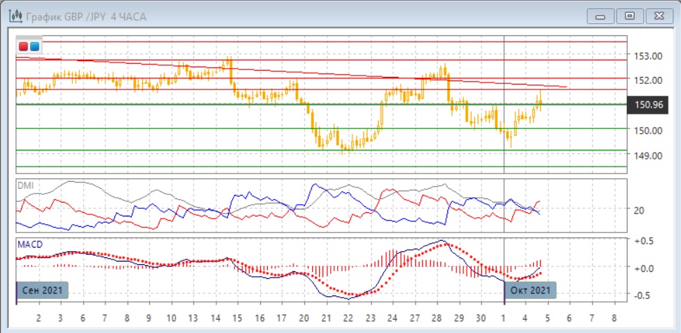 На четырёхчасовом графике пара растёт после приближения к уровню поддержки 149,15. Она находится у зоны сопротивления из уровня 151,55 и линии нисходящего тренда дневного масштаба. Бычьим сигналом на данный момент является преодоление уровня 151,00. Относительные максимумы и минимумы пары сейчас растут. Уровень 151,00 является сейчас поддержкой. При преодолении линии тренда дальнейший рост облегчится, и риска отката уменьшится. До этого рассчитывать на рост рискованно, так как пара находится у сильной зоны сопротивления, которой она уже достигла.