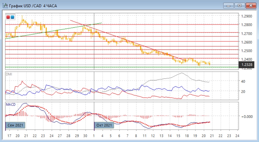 На четырёхчасовом графике снижение продолжилось, относительные максимумы продолжают последовательно снижаться. Некоторое замедление снижения видно по уменьшению наклона графика и образованию бычьего расхождения минимумов пары и гистограммы MACD, однако этот сигнал пока не получил подтверждения. Ближайший "круглый" уровень 1,2300, скорее, будет тестироваться.