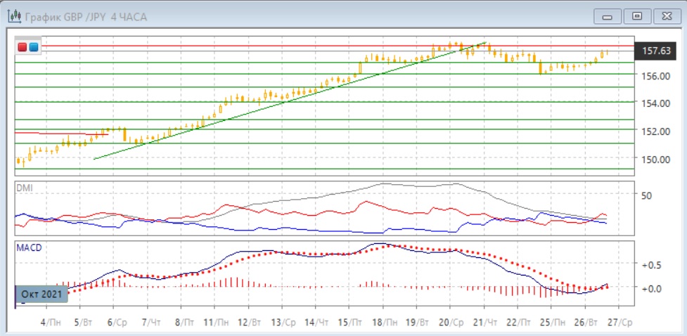 На четырёхчасовом графике пара почти восстановилась до уровня, от которого начался откат (158,00). Краткосрочный разворот произошёл при преодолении уровня 159,80, поддержки и сопротивления 18-25 октября. Пара скорее будет тестировать уровень 158,00, но движение слабое, и при сильном сопротивлении риска отката от этого уровня будет высок. По индикаторам направленного движения тенденцией вновь становится рост: гистограмма MACD растёт уже в положительной зоне, линия MACD развернулась, DM+ теперь выше DM-.