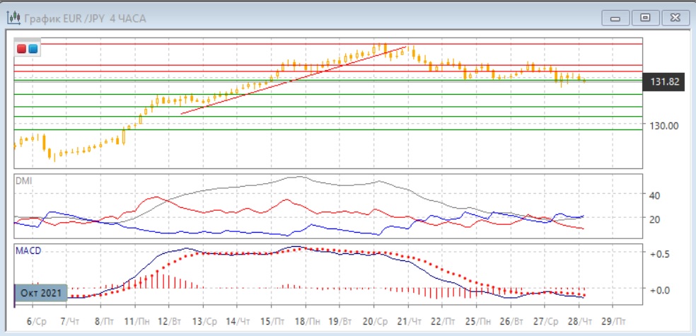 На четырёхчасовом графике сейчас можно рассматривать диапазон 131,90-132,50. Более значительное движение, вероятно, будет в сторону выхода из диапазона. В самом диапазоне картина противоречивая: нижние тени свечей 27 октября показывают, по около нижней границы пара получает поддержку. С другой стороны, к верхней границе пара не вернулась, и пара была ограничена уровнем 132,30, от которого она вернулась к нижней границе диапазона. Это медвежий признак. Другой медвежий сигнал - снижение относительных максимумов и минимумов пары, которое продолжается. Это делает выход из диапазона вниз немного более предпочтительным.