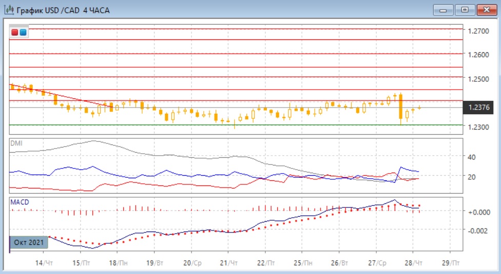 На четырёхчасовом графике пара продолжает находиться в диапазоне 1,2300-1,2400. Ложный пробой верхней границы диапазона и последующий резкий откат 27 октября являются медвежьими сигналами. Сильное движение, которое привело к образованию широкодиапазонной свечи, вероятно, продолжится, и это пока пара ниже 1,2400, и ниже максимума широкодиапазонной свечи, снижение пары к 1,2300 кажется более вероятным в краткосрочной перспективе, а в более долгосрочной перспективы - выход из канала 1,23-124 вниз.