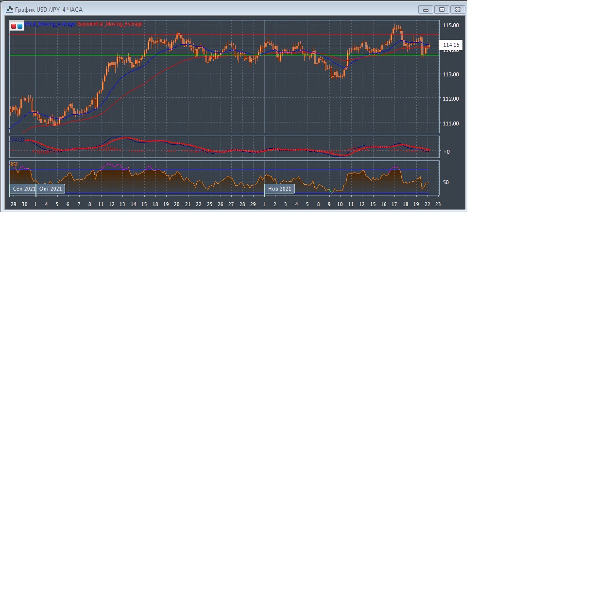 Скользящие средние с периодом 21 и 55 дней замедлились и похоже разворачиваются вниз с возможностью сформировать сигнал на продажу, что свидетельствует о смене тенденции на нисходящую в рамках краткосрочной перспективы. Четырёхчасовой график прогрессирует пока между экспоненциальных скользящих средних, подтверждая слабеющую позицию быков на этом рынке в краткосрочной перспективе.