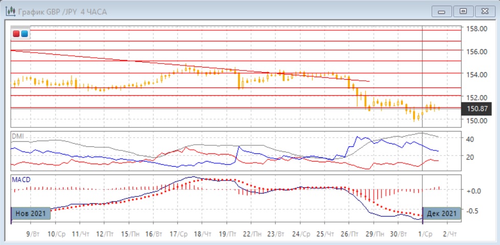 На четырёхчасовом графике пара получила поддержку на следующем уровне поддержки 150,00, однако сильная поддержка находится ниже, на минимумах августа и сентября. У 150,00 образовалось хорошо выраженное бычье расхождение минимумов пары и гистограммы MACD. Закрепление выше 151,00 может быть подтверждением этого сигнала. Однако пока последовательность снижения относительных минимумов пары не нарушена. По ADX тенденция снижения сохраняется: DM- выше DM+. Краткосрочная перспектива, вероятно, будет зависеть от того, преодолеет ли пара уровень сопротивления 151,00: если она останется ниже, вероятно возвращение к 150,00, если уровень будет преодолён, это может показать перспективу более значительного осткока.