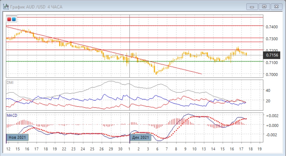 На четырёхчасовом графике пара вернулась ниже "круглого" уровня 0,7200, что выглядит как ложный пробой верхней границы диапазона 0,7100-0,7200. Если предполагать движение в диапазоне, целью видится снижение к нижней границе. По индикаторам направленного движения флэт: DM+ и DM- близки, гистограмма MACD колеблется около нулевого уровня, линия MACD также меняет направление. В условиях диапазона без существенного катализатора (которым не стало даже заседание ФРС) выход него не ожидается.