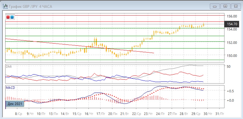 На четырёхчасовом графике замедление роста уже видно, так как положительный наклон графика становится меньше. Также образовалось уже тройное расхождение максимумов пары и гистограммы MACD, что увеличивает вероятность отката. Подтверждением сигнала расхождения может быть преодоление поддержки на 154,00, однако пока этого не произошло, и рост может продолжиться с опорой на этот уровень. По ADX рост является сильной тенденцией: превышение DM+ над DM- остаётся очень большим при высоком уровне ADX.