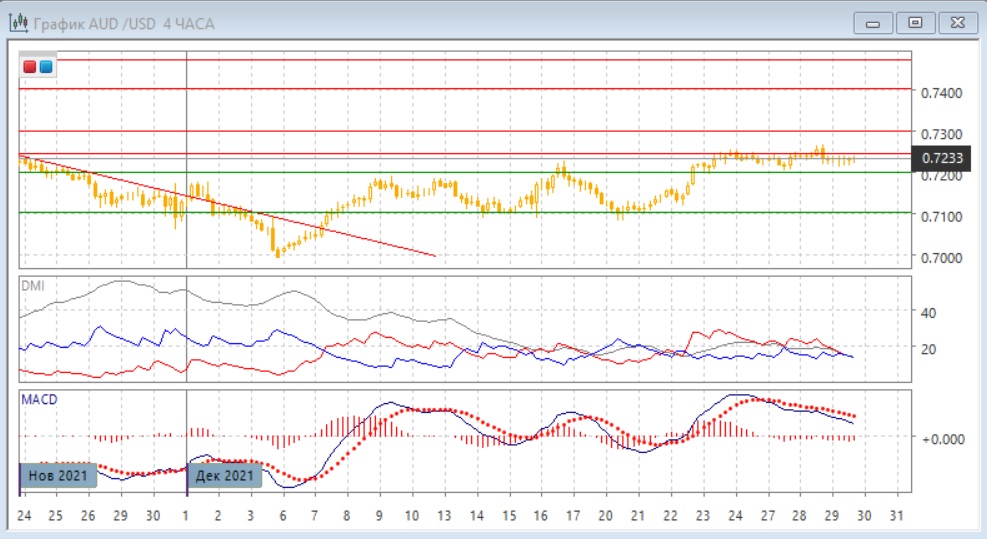 На четырёхчасовом графике тенденция, вероятно, изменилась: пара преодолела минимумы конца декабря и относительные максимумы и минимумы теперь снижаются. По индикаторам направленного движения тенденция также изменилась: DM- теперь выше DM+, гистограмма MACD находится в отрицательной зоне, линия MACD имеет отрицательный наклон. То, что пара не закрепилась ниже уровня поддержки 0,7200, может быть бычьим сигналом - однако для возобновления роста необходимо, что пара и дальше оставалась выше этой ключевой, в этом масштабе, поддержки.