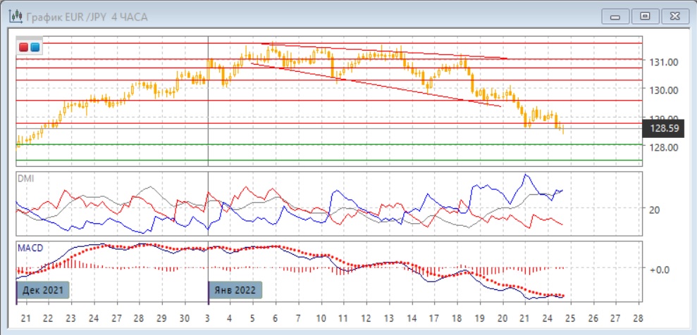 На четырёхчасовом графике последовательное снижение продолжается, относительные максимумы и минимумы пары снижаются. Пара не закрепилась выше поддержки на 128,75, и его можно рассматривать теперь как ближайшее сопротивление. По ADX тенденция снижения остаётся сильной - DM- значительно выше DM+ при относительно высоком уровне ADX. Образовалось тройное бычье расхождение минимумов пары и гистограммы MACD. Это увеличивает вероятность отскока вверх, но этот сигнал не имеет подтверждения.