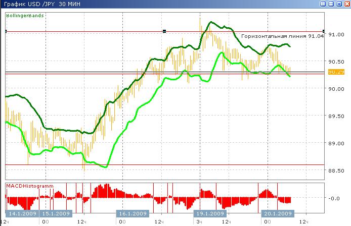 Прекратив свой упорный рост против йены и протестировав 5-дневный максимум 91.00, доллар претерпел небольшую коррекцию и на данный момент движется в торговом диапазоне, ограниченном снизу поддержкой 90.25, а сверху - сопротивлением 91.00. И, судя по индикатору Боллинжера, в ближайшее время цена вряд ли выйдет из этого диапазона.