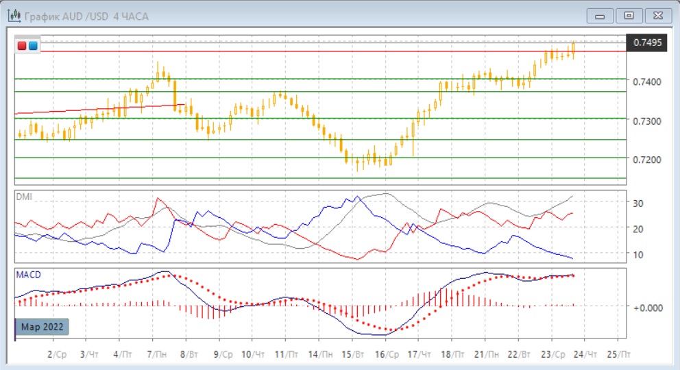 На четырёхчасовом графике пара приблизилась к "круглому" уровню сопротивления 0,7500. Более краткосрочно сопротивление на 0,7470. Образование двух "падающих звёзд" увеличивает вероятность отката после приближения к "круглому" уровню. Однако закрытие выше 0,7470, несмотря на медвежьи сигналы (несколько дней неудачного тестирования и "падающие звезды") может быть бычьим сигналом. Уровень 0,7500 скорее будет тестироваться. По ADX тенденция роста сильная: DM+ значительно выше DM-, ADX на высоком уровне. Образование медвежьего расхождения максимумов пары и гистограммы MACD укрепляет сопротивление на 0,7470 и 0,7500.