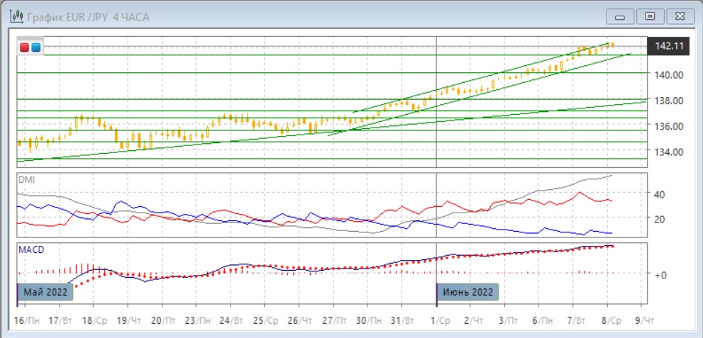 На четырёхчасовом графике пара с конца мая остаётся в узком восходящем канале, сейчас она находится у его верхней границы. Последовательный рост относительных максимумов и минимумов продолжается. Признаков разворота пока не видно. Как и в более крупном масштабе, вероятность отката увеличивает размер движения без существенных откатов, а также период - с конца мая. По ADX в этом масштабе тенденция роста очень сильная: превышение DM+ над DM- очень большое при очень высоком и растущем уровне ADX. Это также может сигнализировать о том, что откат назревает - такая ситуация редка. Однако против сильной тенденции роста идти не стоит.