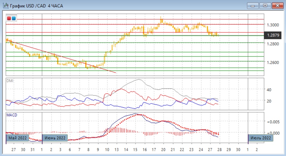 На четырёх часовом графике пара вышла вниз из диапазона 1,2910-1,3000. Если рассматривать его расширенно, с нижней границей на 1,2875, то пара ещё остаётся в диапазоне, но консолидация идёт на нижней границе, что делает более вероятным выход из диапазона вниз. И для узкого, и для более широкого диапазона выход вниз более вероятен из-за ложного пробоя вверх 17 июня. Направление движения сейчас изменилось, так как относительные максимумы и минимумы пары снижаются. Краткосрочно следующей целью является "круглый" уровень 1,2800.