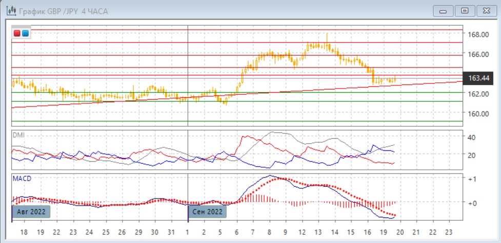 На дневном графике пара снижается в диапазоне с апреля. Закрытие ниже уровня сопротивления 163,75 сделает следующей целью поддержку на 162,00. Пара, однако, выросла после приближения к одному из вариантов восходящего тренда, если строить его с начала августа. Он укреплял поддержку при приближении к 162,00. Если рассматривать движение за месяц, то рост сначала сентября был почти полностью нейтрализован. Сейчас это, скорее, является медвежьим сигналом. По индикаторам направленного движения тенденция роста исчезла: DM+ и DM- сравнялись, гистограмма MACD снизилась к нулевому уровню, линия MACD разворачивается.