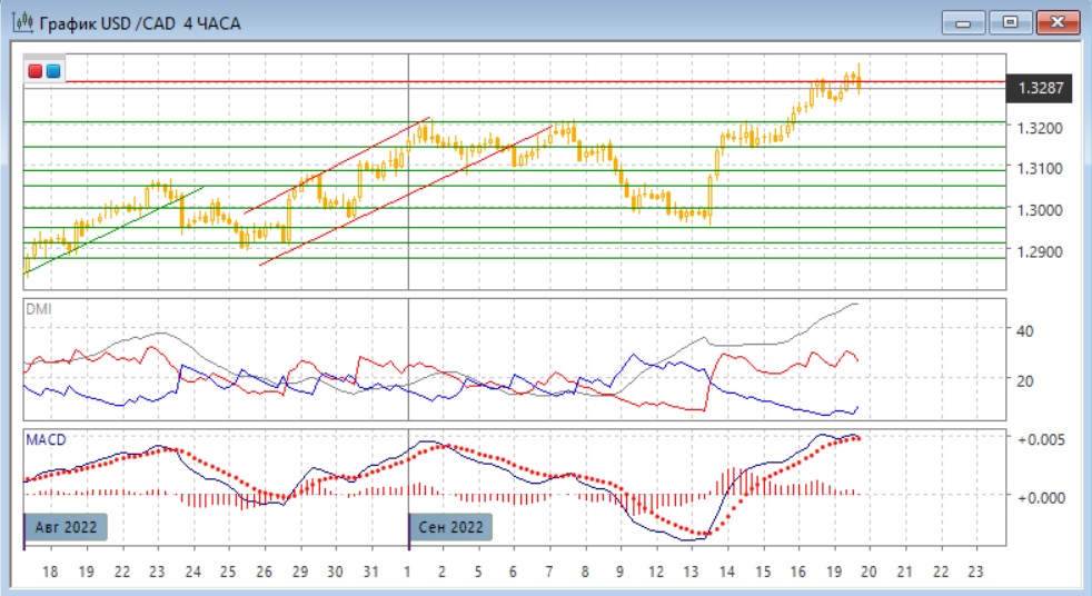 На дневном графике снижение сильный рост после того, как пара удержалась выше психологически важного уровня 1,3000, привел её с закрытию выше сопротивления на 1,3200 и достижению следующего "круглого" уровня 1,3300. Однако сейчас может произойти откат к 1,3200, так как до этого волна роста без откатов достигла 400 пунктов, что много для пары. Кроме этого, новый максимум не подтверждается по MACD - образовалось медвежье расхождение, что увеличивает вероятность отката. Тем не менее, выход пары из широкого диапазона вверх открывает дорогу в возможному дальнейшему росту, потенциально большому по размеру. Однако для этого необходимо закрепление выше 1,3200. По ADX тенденция роста остаётся сильной: превышение DM+ над DM- большое, ADX на высоком уровне.