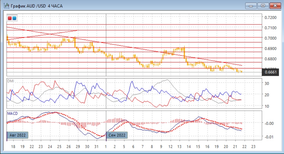 На дневном графике в целом ситуация не изменилась: пара осталась ниже нисходящего тренда и ниже уровня сопротивления 0,670 (таким образом, ниже минимумов июля и начала сентября). Закрепление пары ниже следующего "круглого" уровня и обоснованного уровня поддержки облегчает дальнейшее снижение, так как рядом поддержки уже не видно. Относительные минимумы пары продолжают снижаться. Образование бычьего расхождения относительных минимумов пары и гистограммы MACD увеличивает вероятность отскока, но это сигнал не имеет подтверждения. По индикаторам направленного движения тенденцией является снижение: DM- выше DM+, гистограмма MACD остаётся в отрицательной зоне, линия MACD сохраняет отрицательный наклон.
