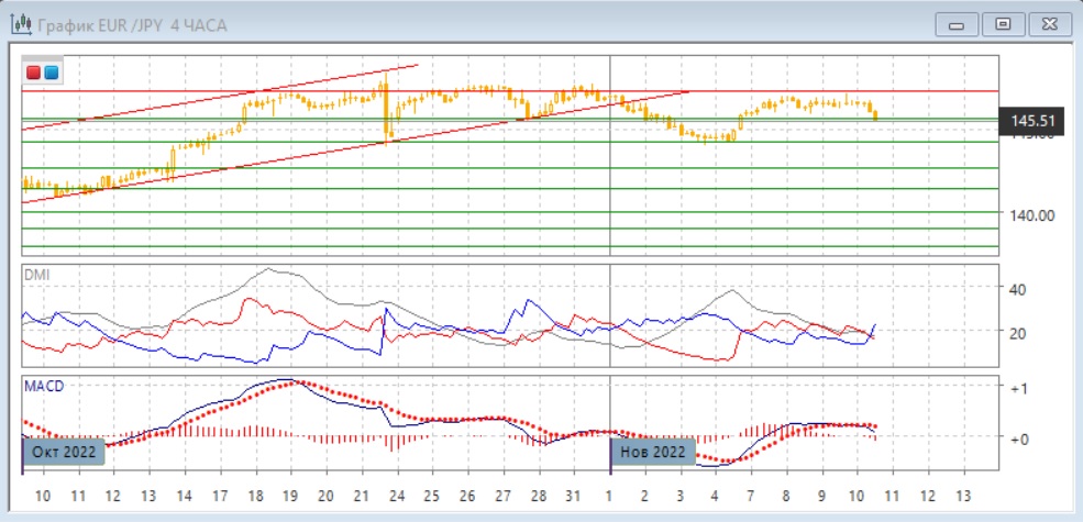 На дневном графике пара снижается от сильного уровня сопротивления 147,35, таким образом, это уровень ещё сильнее укрепился, так как около него образуется ещё один максимум. В рамках диапазона с середины октября 144,30-147,35 стоит ожидать снижения к нижней границе, которая ранее была верхней границей более широкого диапазона.