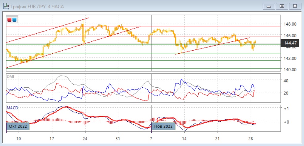 На четырёхчасовом графике пара остаётся ниже краткосрочного восходящего тренда в середине ноября, при отскоке 24 ноября линия тренда выступила сопротивлением. Хотя сейчас пара восстановилась выше важного уровня 144,30, пока пара ниже 145,65, более вероятным остаётся возобновление роста. Факторов риска является образование разворотной свечной комбинации с "падающей звездой" в понедельник. По ADX тенденция снижения сохраняется: DM- устойчиво выше DM+.