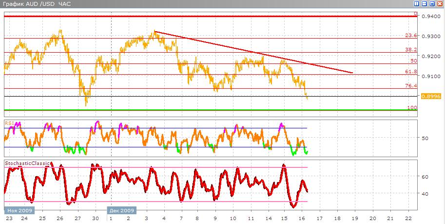 Австралийский доллар сейчас продолжает падение с выходом отрицательных новостей по ВВП Австралии «помогло» торговаться с понижением относительно доллара США. Сейчас торговля проходит ниже 0,9000 и укрепляется в этой зоне дальнейшее направление скорее всего будет к уровню 100% по Фибоначчи. В альтернативном варианте происходит отскок в покупку до уровня в 61,8% по Фибоначчи или 0,9100. Стандартные индикаторы торговли весьма необпределенны в движении в покупку или продажу. Stohastic в продаже и находится в середине своего значения, а RSI разворачивается в покупку из зоны перепроданности, что означает что скорее всего он достиг своего дна на данный момент.
