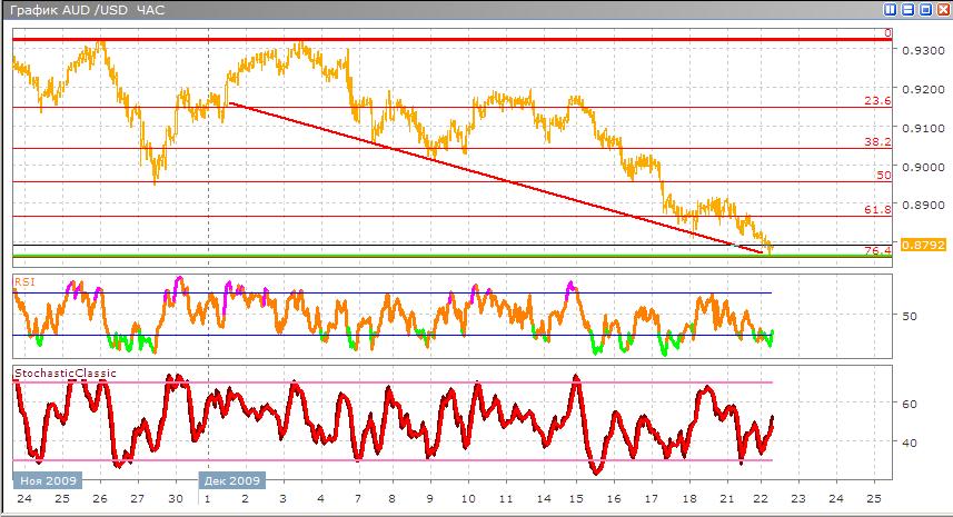 Стандартные индикаторы торговли показывают покупку Stohastic развернулся в покупку после пересечения скользящих почти у края зоны перепроданности, RSI аналогично выходит из перепроданности и направился в покупку, это все указывает на довольно сильный сигнал к покупке австралийского доллара.
