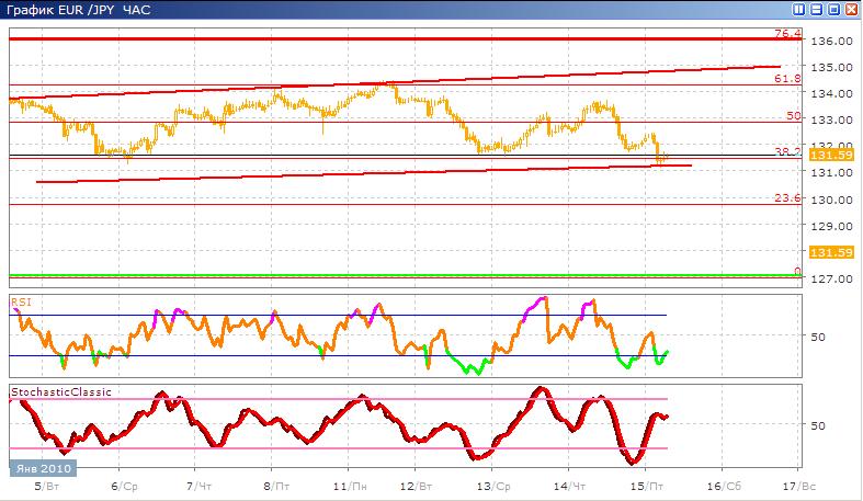 Евро-йена пока еще находится в боковом движении и канал свой не пробивала в какую-либо сторону. Сейчас торговля движется в вверх от нижней границы канала, скорее всего, движение по каналу будет сохранено, хотя курс может и поменяться. В альтернативном варианте движение вниз будет продолжено и канал будет пробит, после этого курс отправится ниже уровня 38,2% по Фибоначчи в сторону 23,6%. Классические индикаторы показывают разнонаправленные сигналы, Stohastic пересекся двумя скользящими вниз указывая направление движения, а RSI напротив вышел из зоны перепроданности и направляется вверх.