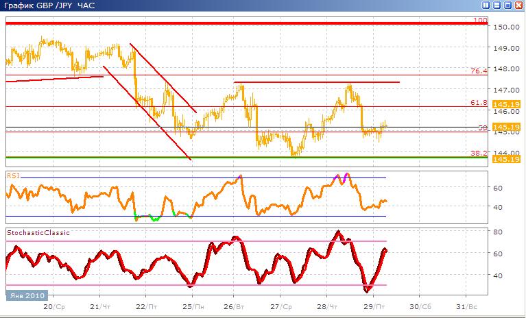 Валютная пара продолжает движение уже в боковом канале и сейчас торгуется между уровнями 76,4% и 38,2% по Фибоначчи. Скорее всего дальнейшее движение будет по-прежнему проходить в этом коридоре, хотя возможна корректировка в долгосрочной перспективе. В альтернативном варианте возможно, что движение пары будет проходить выше 76,4% по Фибоначчи. Классические индикаторы показывают продолжение сигнала покупки где Stohastic после пересечения своих скользящих направлен вниз и вот вот достигнет зоны перепроданности, а RSI также движется в эту сторону.