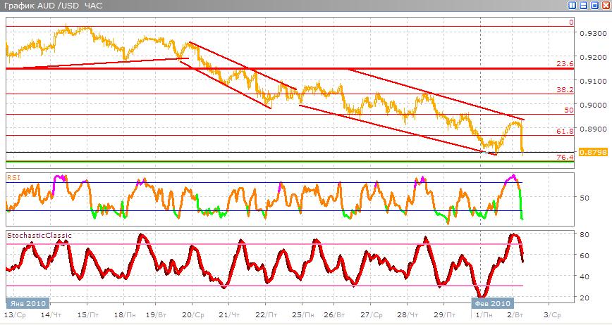 Австралийский доллар еще раз пробивает свою поддержку нисходящий тренд будет продолжен, сейчас торговля проходит возле минимумов 0,8800 и он намеревается отправится к поддержке возле 76,4 по Фибоначчи. После выхода информации, что текущая ставка останется без изменений позволяет предположить, что тренд останется сильным.
