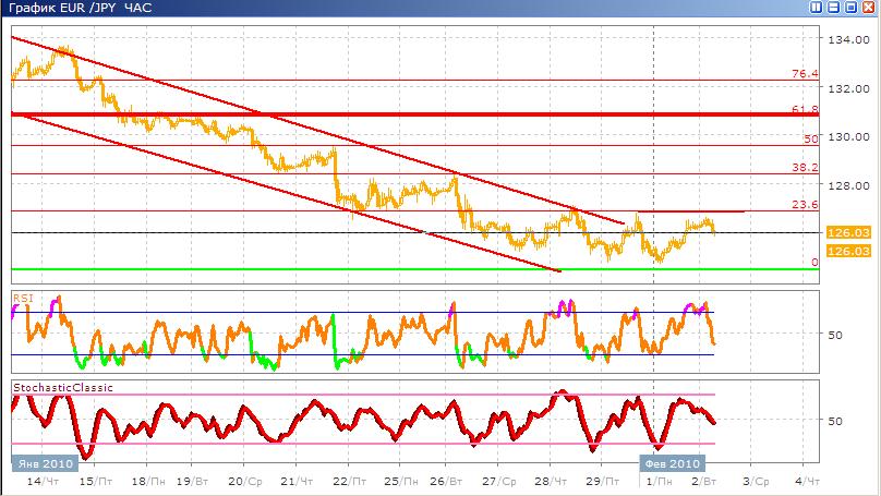 Евро-йена остановилась после столь сильного нисходящего тренда и сейчас торгуется в боковом канале возможно это просто небольшая передышка и после тренд снова будет направлен вниз, но пока канал проходит между 0% и 23,6% по Фибоначчи. В альтернативном варианте после отскока возможно, что валютная пара пробьет текущий боковой канал и направится выше 23,6% по Фибоначчи. Классические индикаторы показывают сигнал к продаже. Stohastic после пересечения средних скользящих по-прежнему направляется вниз, а RSI колеблется недалеко зоны перепроданности.