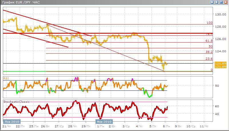 Евро-йена пробивает текущую поддержку и уходит далеко ниже нее, сейчас торговля проходит возле отметки 121,80, ранее был достигнут абсолютный минимум с прошлого года. Скорее всего произойдет небольшой отскок от 0% к 23,6% по Фибоначчи. В дальнейшем нисходящий тренд будет продолжен и текущие сильные уровни поддержки будут снова пробиты. Классические индикаторы показывают продолжение сигнала к покупке. Stohastic после двух пересечений средних скользящих направлен вверх, а RSI также отскакивает от зоны перепроданности и начинает движение вверх.