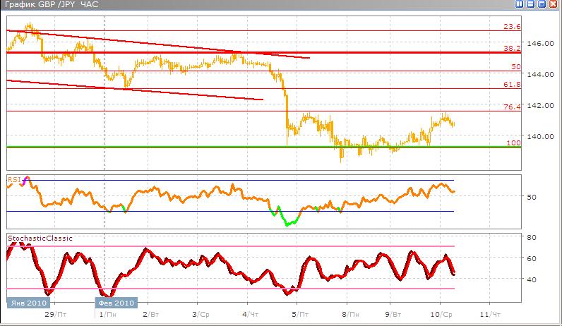 Торговая пара продолжает торговаться возле линии поддержки, после корректировки нисходящего тренда. Сейчас торговля проходит между 76,4% и 100% по Фибоначчи, скорее всего дальнейшее движение будет продолжаться в этом же пределе. В альтернативном варианте возможно, что поддержка будет пробита и торговля переместится ниже 139,00. Классические индикаторы показывают сигнал к продаже, Stohastic после неоднократных пересечений своих скользящих направлен вниз, двигался зигзагообразно, а RSI находится ближе к верху от границы зоны перекупленности.