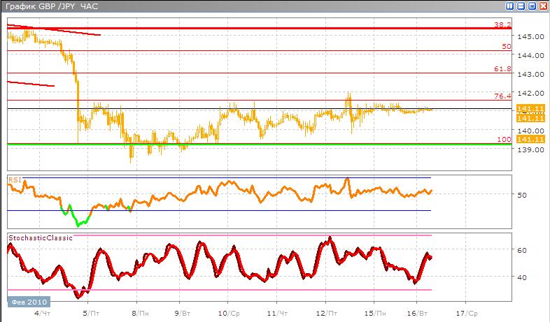 Торговая валютная пара не изменила свой диапазон торговли и также находится между двух уровней это 76,4% и 100% по Фибоначчи, сейчас изменения по этой паре еще стали менее значительными, что указывает на возможное скорое быстрое изменение курсов. Скорее всего дальнейшее движение будет вниз, но достигнув линии поддержки курс отобьется, а далее продолжит свою торговлю в канале. В альтернативном варианте торговля может вестись и ниже этого канала. Классические индикаторы показывают начало сигнала к покупке, Stohastic после пересечения своих скользящих направлен вниз, а RSI совершает незначительные движения в пределах уровня 50.