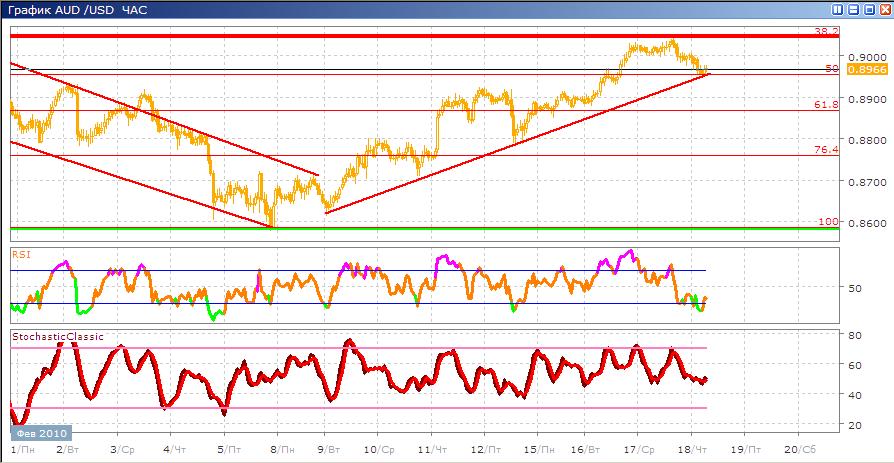 Австралийский доллар по-прежнему находится в умеренно восходящем тренде и после пробития линии сопротивления продолжает рост. Скорее всего, текущее сопротивление окажется для австралийца довольно сильным уровнем и он не сразу сможет его пробить, но позже он это сделает. В альтернативном варианте будет пробой линии тренда и отскок от сопротивления и уход в сторону 61,8% по Фибоначчи. Стандартные индикаторы торговли указывают на сигнал покупке, Stohastic несколько раз пересекается своими скользящими средними и сейчас направлен вверх, а RSI разворачивается от зоны перепроданности вверх.