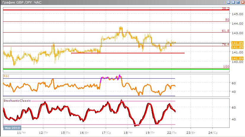 Торговая валютная пара продолжает находится во флете и сейчас торговля ведется в небольшом интервале между 100% и 61,8% по Фибоначчи. Это означает, что валюта пока не определилась с трендом. Скорее всего, дальнейшее движение будет также проходить в этом канале, может чуть выше в пределах 50% по Фибоначчи. Классические индикаторы указывают на сигнал к продаже, Stohastic после пересечения своих скользящих направлен вниз, а RSI находится в пределах не граничащих с зоной перекупленности, но направлен вниз.