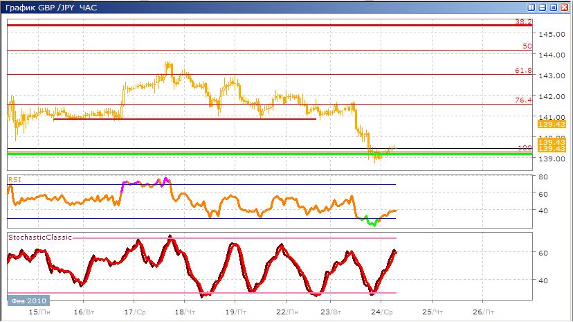 Торговая валютная пара после бокового движения отскакивает от уровня 76,4% по Фибоначчи и уходит к линии поддержки, после того как курс слегка пробивает ее он снова направляется в к предыдущему уровню. Скорее всего дальнейшее движение будет в эту сторону, по-прежнему в тех же пределах 61,8% и 100% по Фибоначчи. В альтернативном варианте, возможно, что курс снова пробьет поддержку, но на этот раз уйдет ниже ее. Классические индикаторы указывают продолжение сигнала к покупке, Stohastic после пересечения своих скользящих направлен вверх, а RSI выходит из зоны перепроданности и направлен вверх.