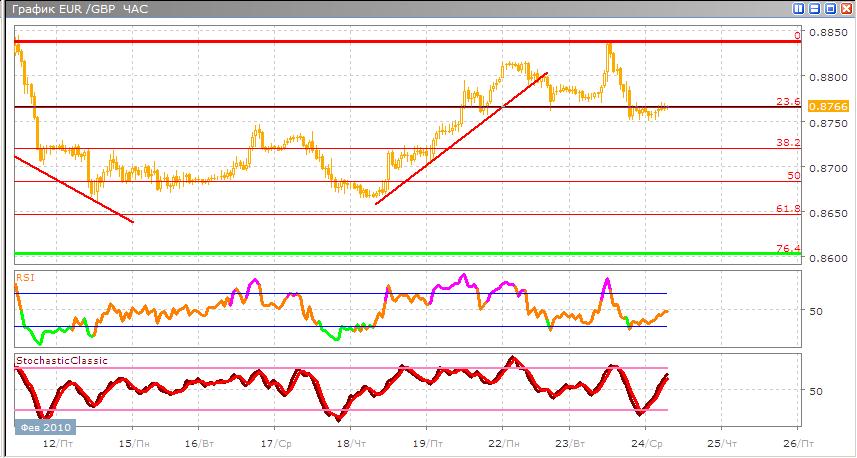 Валютная пара после резкого роста до уровня сопротивления совершила отскок назад к уровню 23,6% по Фибоначчи. Сейчас торговля ведется возле этого уровня, дальнейшее движение будет также примерно в этих пределах 0% - 38,2%. В альтернативном варианте возможно, что курс будет двигаться выше уровня сопротивления. Торговые индикаторы указывают нам на продолжение сигнала покупки, Stohastic пересекается скользящими средними сверху вниз в зоне перепроданности и идет по направлению вверх, а RSI также выходит из этой зоны по направлению вверх.