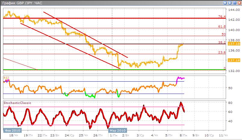 Торговая пара после отскока от линии поддержки направилась на вверх и достигает уровня в 38,2% по Фибоначчи, похоже, что пока это корретировочное движение иссякает и дальнейшее направление пары будет от 38,2% к уровню 23,6%. Но в целом главное движение все пока будет оставаться восходящим и все корретировки будут являться временными. В альтернативном варианте торговли возможно, что дальнейший рост остановился и валютная пара будет двигаться вниз к поддержке. Классические индикаторы указывают на сигнал к продаже, Stohastic разворачивается в зоне перекупленности после пересечения своих скользящих средних сверху вниз, а RSI находится в зоне перекупленности и также разворачивается.