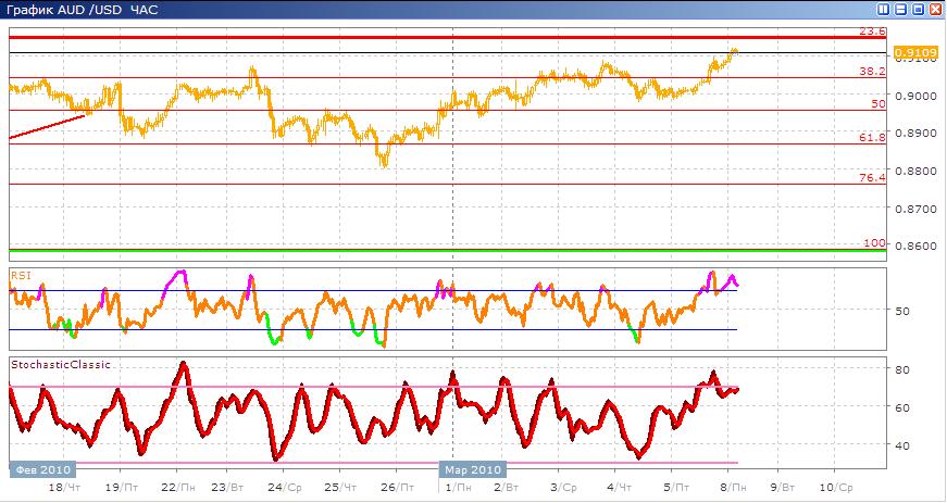 Австралийский доллар как и предполагалось продолжает движение в валютном коридоре между двумя сильными уровнями для него это 23,6% и 50% по Фибоначчи или 0,9153 и 0,8960 соответственно. Дальнейшее движение пары будет скорее всего проходить на этих же уровнях. В альтернативном варианте торговли возможно, что валютная пара пойдет ниже отметки 50% по Фибоначчи на сильных новостях по экономике США. Стандартные индикаторы торговли указывают на разносторонний сигнал, Stohastic пересекается скользящими средними снизу вверх но находится в близи зоны перекупленности, а RSI подходит к зоне перекупленности и разворачивается вниз.