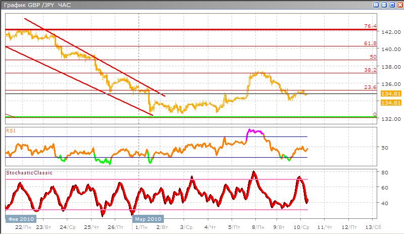 Торговая пара после своего роста от поддержки с корректировалась к 23,6% по Фибоначчи, скорее всего дальнейшее движение будет вверх снова к 38,2%. Сейчас пара двигается вдоль уровня 23,6 по Фибоначчи. В альтернативном варианте валютная пара пойдет вниз и лишь уровень поддержки может остановить дальнейшее движение ее. Классические индикаторы указывают на сигнал к покупке, Stohastic разворачивается после пересечения своих скользящих средних снизу вверх, а RSI выходит из зоны перепроданности и направлен вверх к противоположной зоне.