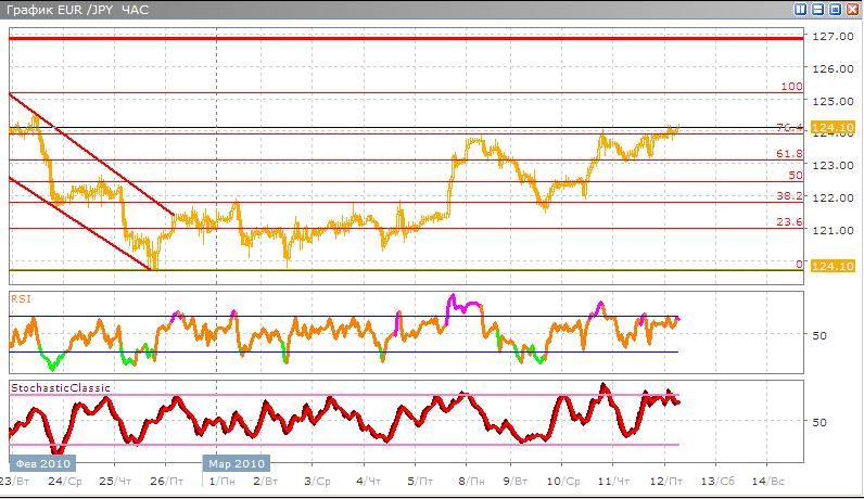 Пара евро-йена после бурного роста находится выше уровня 76,4% по Фибоначчи, скорее всего, валютная пара берет небольшой перерыв и дальнейшие движения буду не значительны и проходить в пределах 50% и 100% по Фибоначчи. В альтернативном варианте возможно, что понижательное давление окажется сильнее и пара пойдет вниз к 50% и ниже. Классические индикаторы указывают нам разнонаправленный сигнал. Stohastic пересекается скользящими средними снизу вверх но почти возле зоны перекупленности, а RSI после нескольких зигзаговых движений разворачивается от зоны перекупленности.