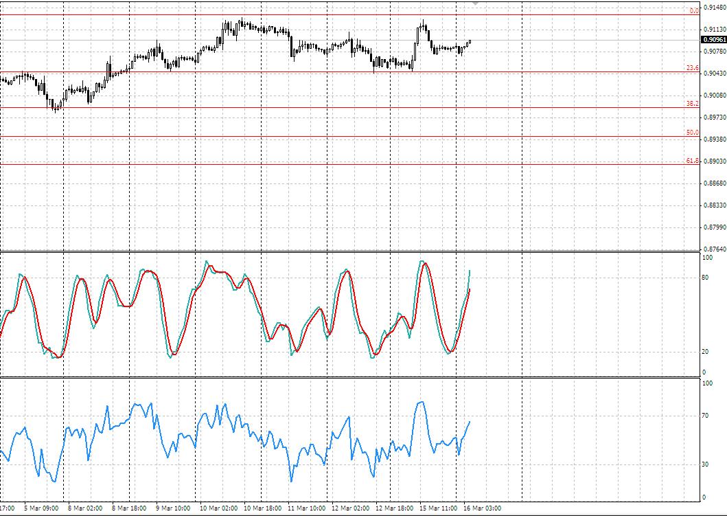 Валютная пара по-прежнему находится в боковом движении между двух уровней 23,6% и 0% по Фибоначчи. Скорее всего, дальнейшее движение будет продолжаться в этом направлении. В альтернативном варианте торговля будет вестись с пробоем канала в сторону понижения к уровню 38,2% и ниже. Торговые индикаторы указывают на сигнал к покупке , Stohastic пересекается своими скользящими средними снизу вверх, а RSI направлен вверх, что также усиливает сигнал.