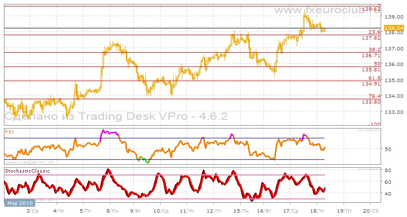Торговая пара после преодоления сопротивления, пара отскакивает от максимума 0% или 139,60 по Фибоначчи и направляется к 23,6%. Сейчас пара продолжает нисходящее движение в сторону к 38,2% и скорее всего это движение будет продолжено. В альтернативном варианте торговли валютная пара продолжит восходящее движение и пробьет новое сопротивление на своем пути к 140,00. Классические индикаторы указывают на сигнал к продаже, Stohastic разворачивается после нескольких пересечений своих скользящих средних сверху вниз, но это происходит недалеко от зоны перепроданности. RSI выходит из зоны перекупленности.